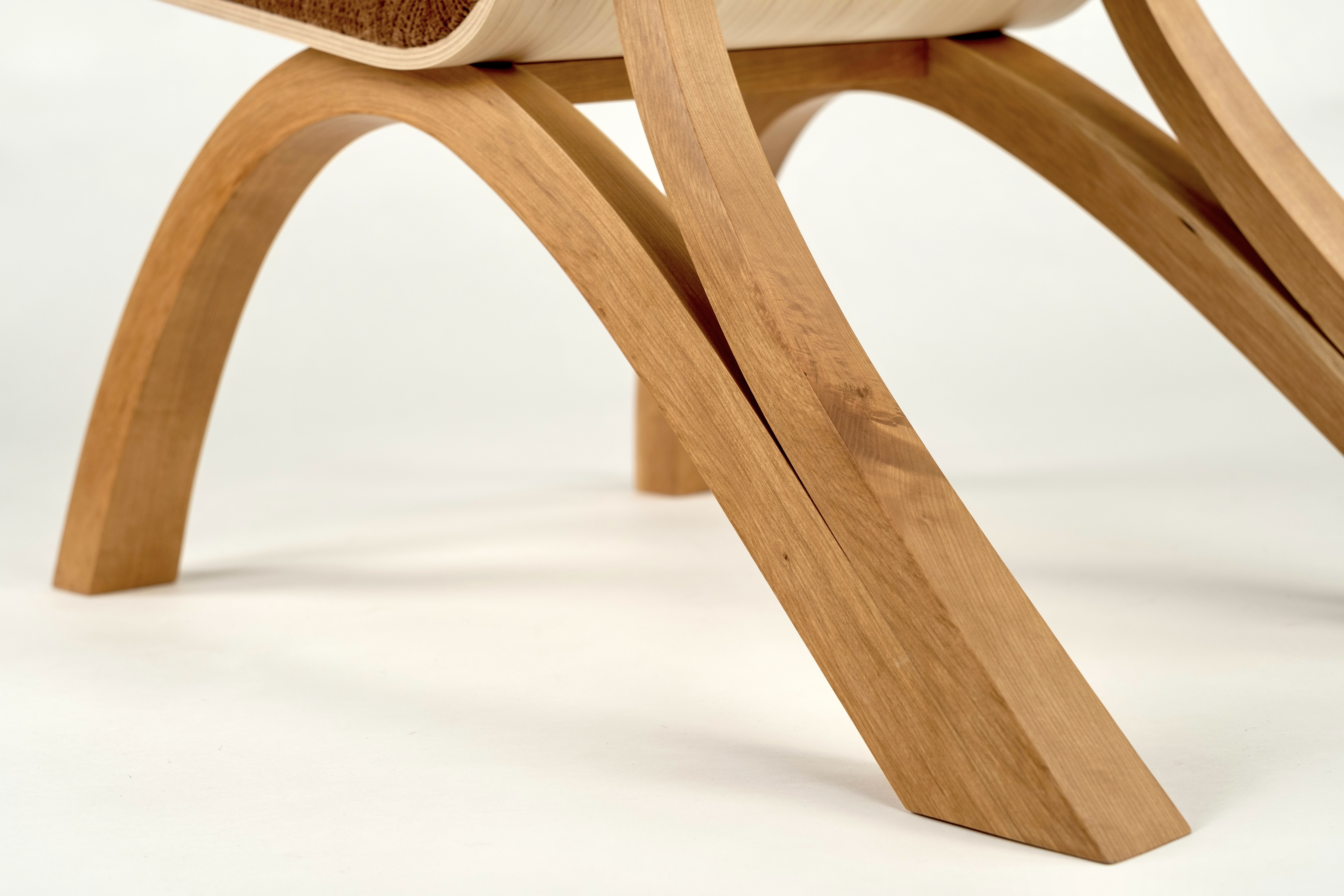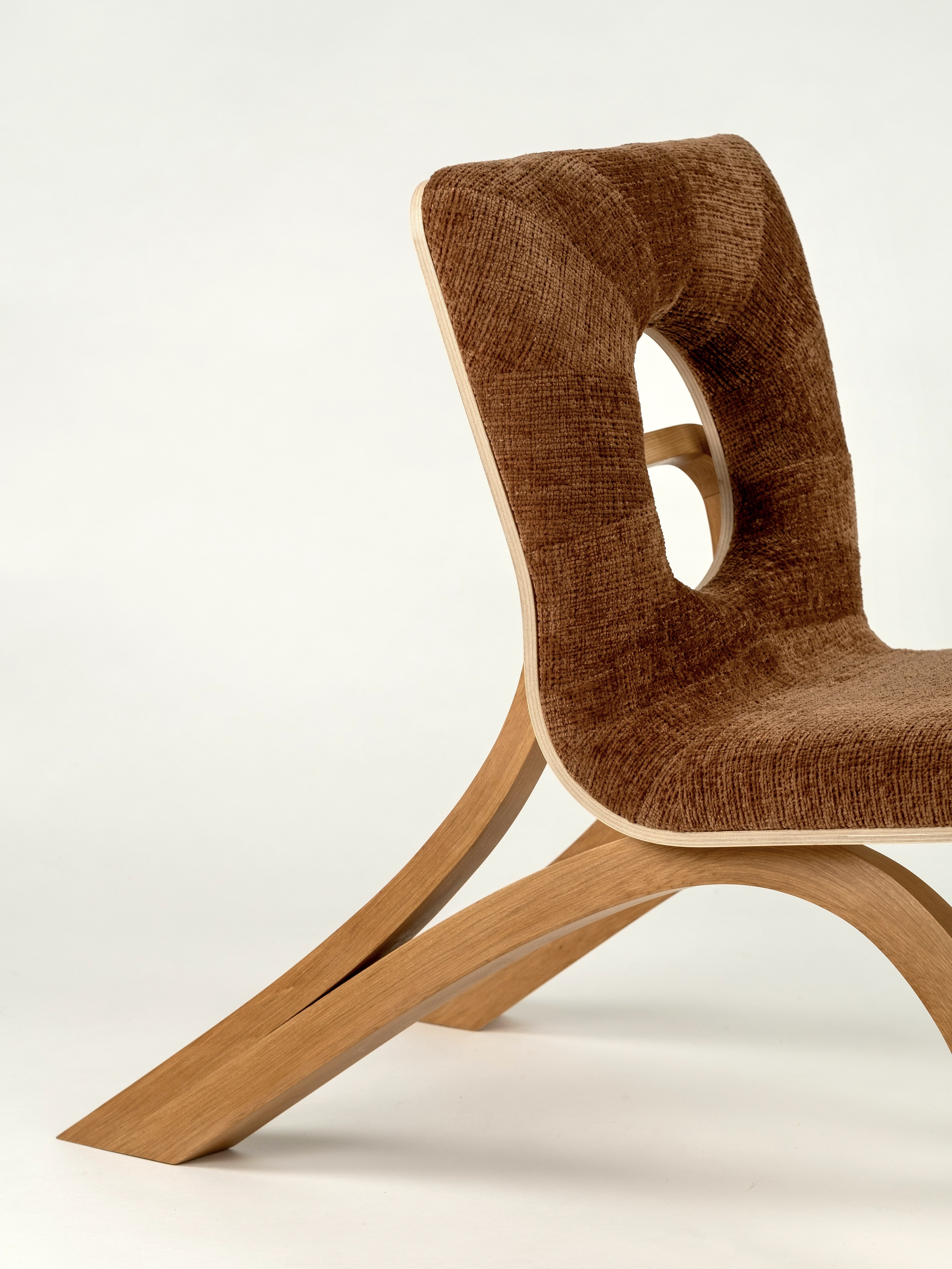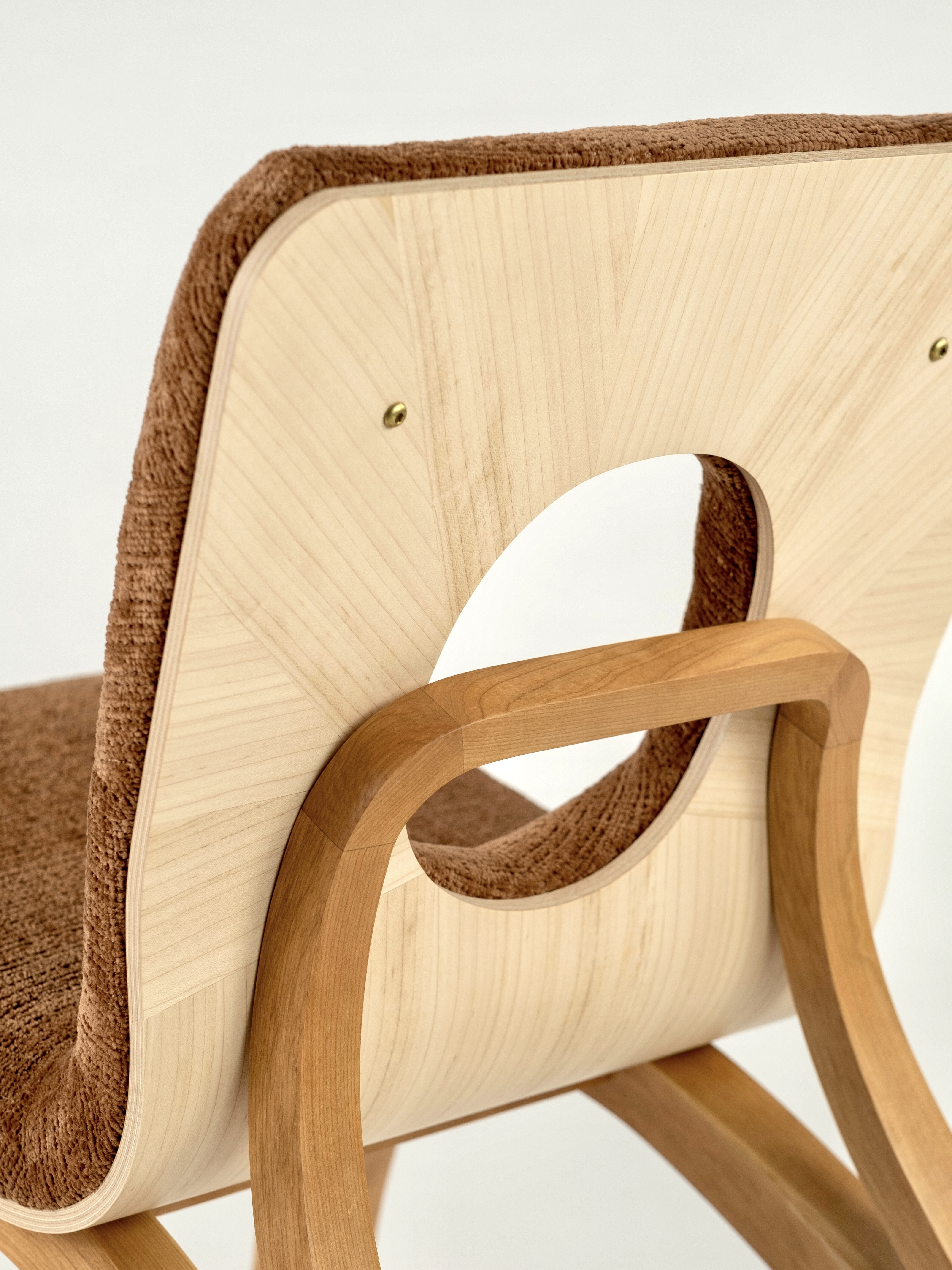 a study in the balance of curves and stability, this chair was constructed with bent-laminated cherry legs and back supports and an eastern maple-veneered bent plywood seat. i also patterned and sewed the upholstery myself.
